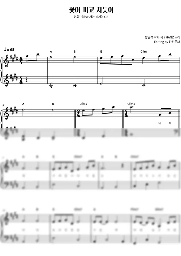 이번 악보는 [HANZ 님의 ‘꽃이 피고 지듯이’] 초급 버전 입니다 🎹