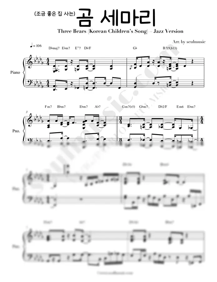 동요 〈곰 세마리〉를 Jazz 로 편곡한 피아노 솔로 악보입니다.