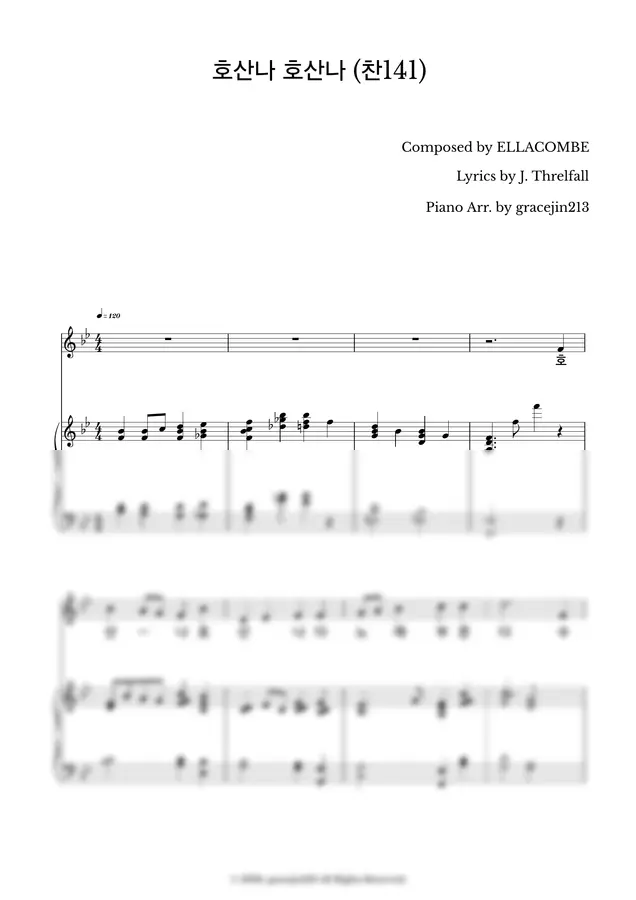 찬송가 141장 호산나 호산나 피아노 리하모니 악보♡ (Bb key)