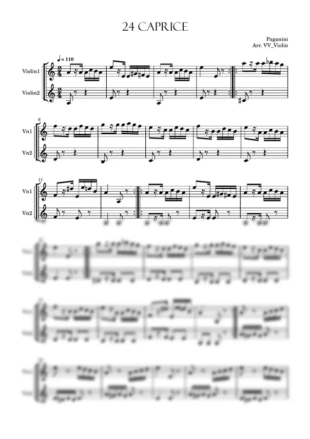 바이올린 레슨이나 음악회, 소규모 앙상블에서 연주하기 좋은 '파가니니 카프리스 24번' 쉬운 바이올린 2중주 악보입니다.