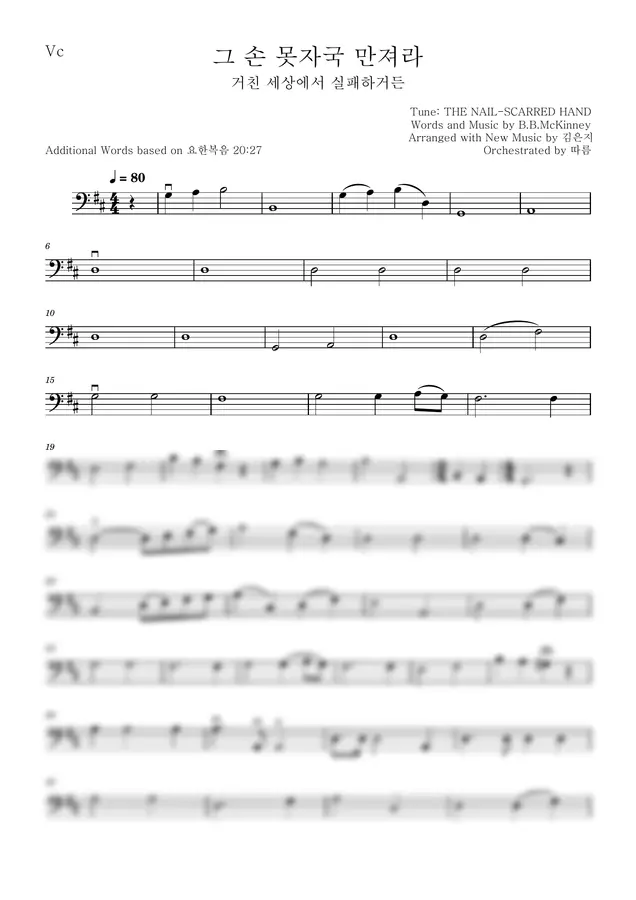 4부합창(SATB)과 함께 연주할 수 있도록 편곡된 첼로 반주 악보입니다.