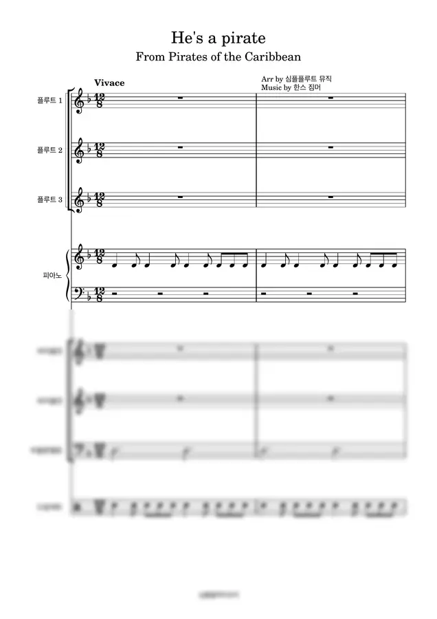 캐리비안의 해적 OST - He's a pirate-[플루트][바이올린][첼로][피아노][쉬운 악보] 1p 미리보기