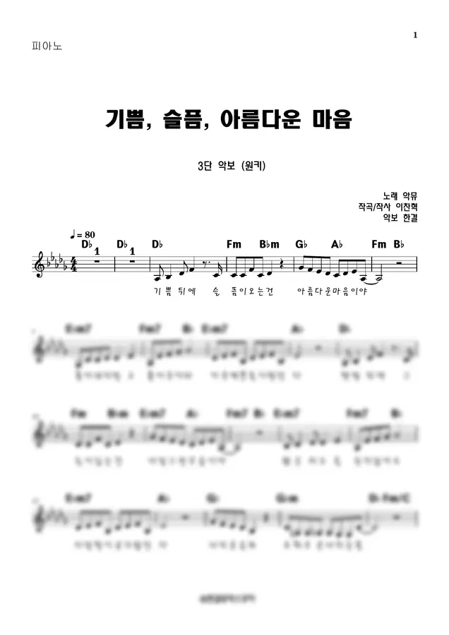 악뮤(AKMU, 악동뮤지션) - 기쁨, 슬픔, 아름다운 마음 (멜로디 악보, 원키) by 한결 2p 미리보기