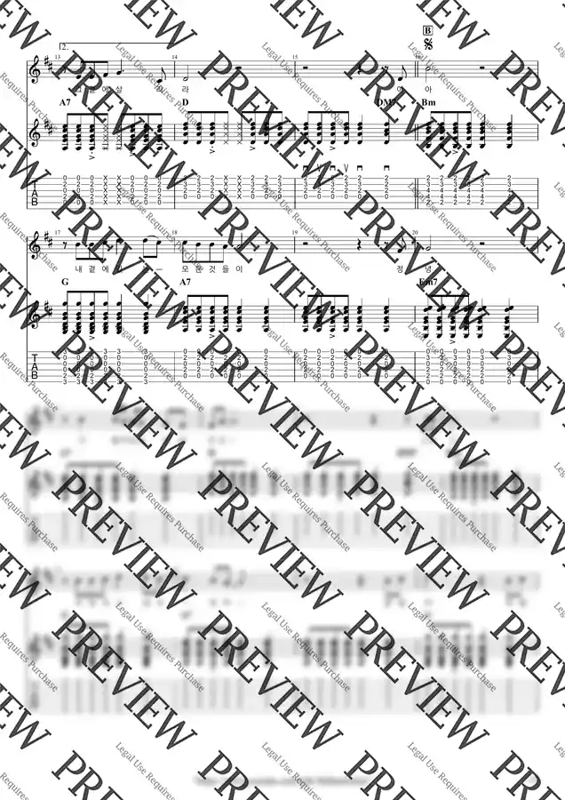 K-Halbae Guitar (+) 악보는 오선, 타브, 운지, 코드 다이어그램 등 모든 기보를 다 표현하도록 업데이트 된 연습용 원본 악보와, 페이지 넘김을 최소화 한 제본용 악보까지 두 개의 악보를 모두 제공해 드립니다. 원본 악보로 연습한 후 제본용 악보를 악보집에 담아 편리하게 연주하실 수 있습니다. (2페이지 이내면 원본, 제본 악보 동일할 수 있음)