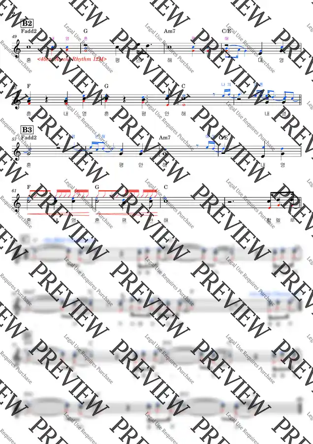 메인 멜로디와 함께 리듬 인,아웃 및 리듬 섹션과 리허설 마크가 표기 되어 있고,