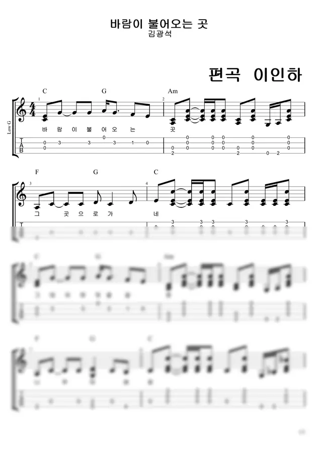 김광석 - 바람이 불어오는 곳 (컨츄리주법) by 이인하 2p 미리보기
