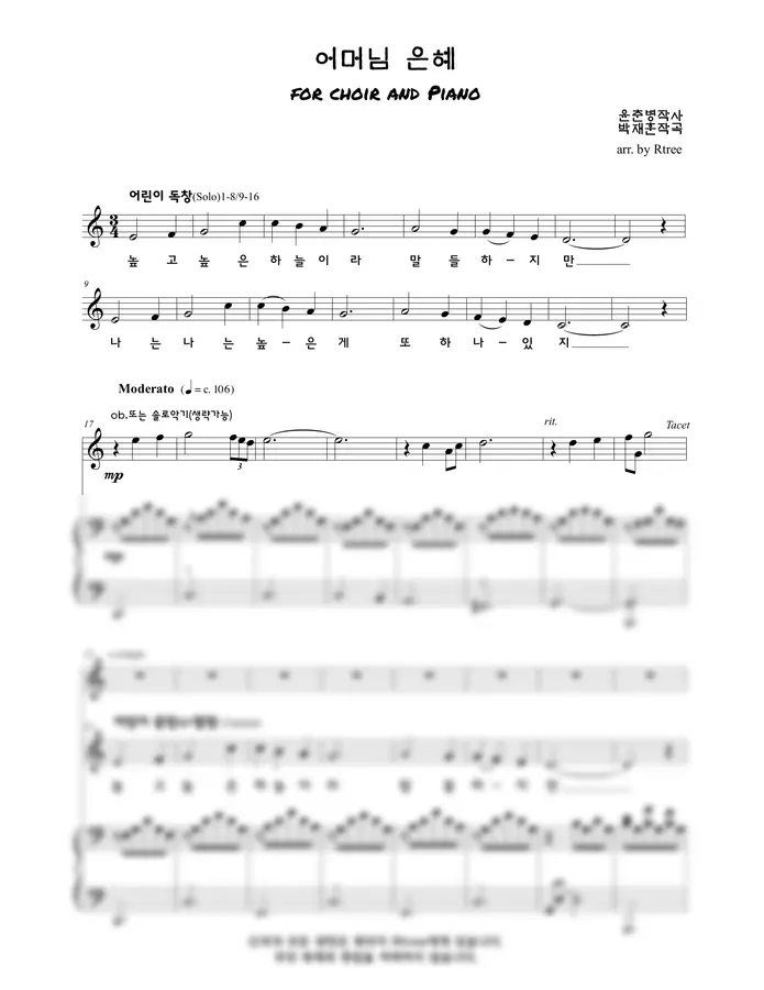 부모님은혜, 쉬운 합창곡과 피아노 반주로 구성되어 있습니다.