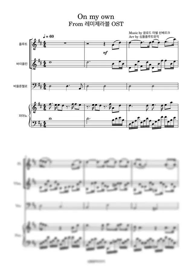 뮤지컬 레미제라블 OST - On my own-[플루트][바이올린][피아노][쉬운 연주회 곡]