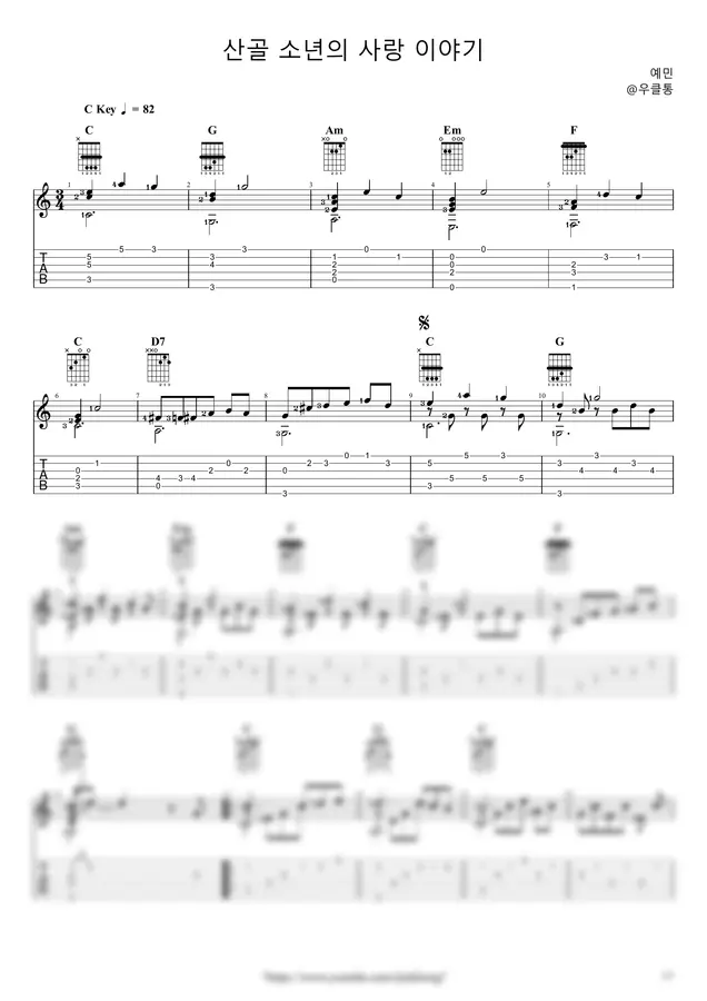 |우클통|의 악보는 오선+타브+가사+운지+코드 등을 잘 기록하고 있습니다.