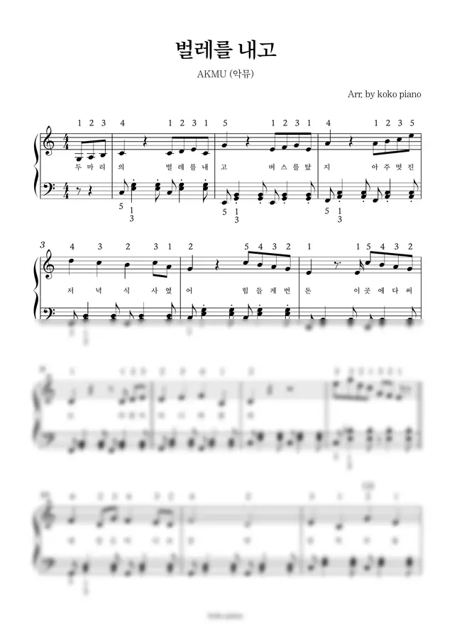 AKMU(악뮤) - 벌레를 내고 (다장조, 짧고 쉬운 악보) (손가락번호 O) by 코코피아노