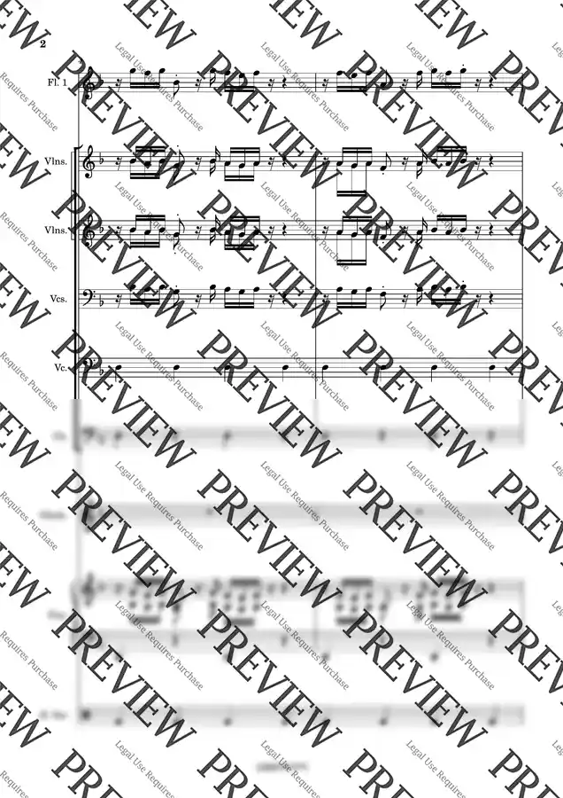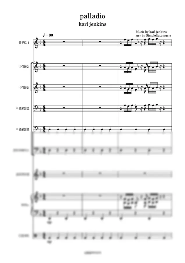 악보는 현악기와 플루트 드럼 피아노 구성으로 되어 있습니다.