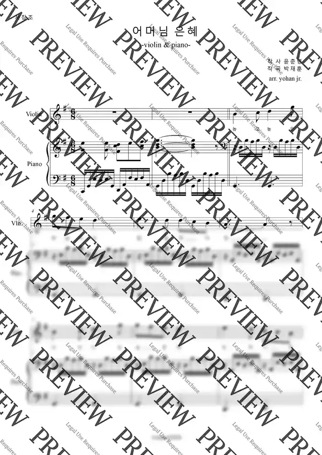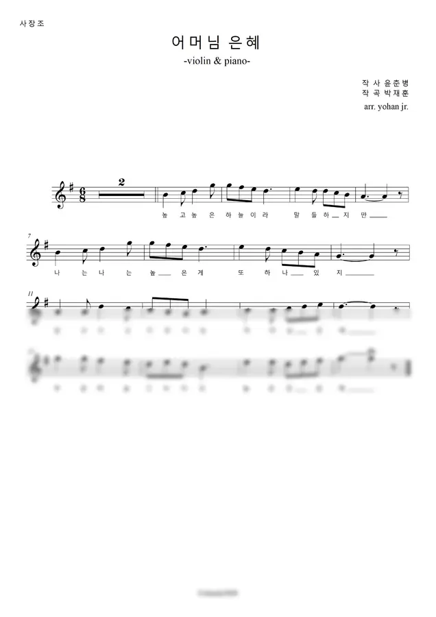 '어머님 은혜'를 바이올린으로 연주할 수 있도록 편곡한 악보입니다. 사장조로 조옮김을 하였고 다장조 편곡버전도 있습니다. 반주영상을 따로 업로드 하였으니 연습할때 이용해보세요~