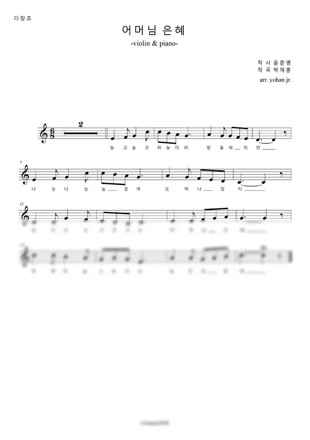 '어머님 은혜'를 바이올린으로 연주할 수 있도록 편곡한 악보입니다. 다장조로 조옮김을 하였고 사장조 편곡버전도 있습니다. 반주영상을 따로 업로드 하였으니 연습할때 이용해보세요~