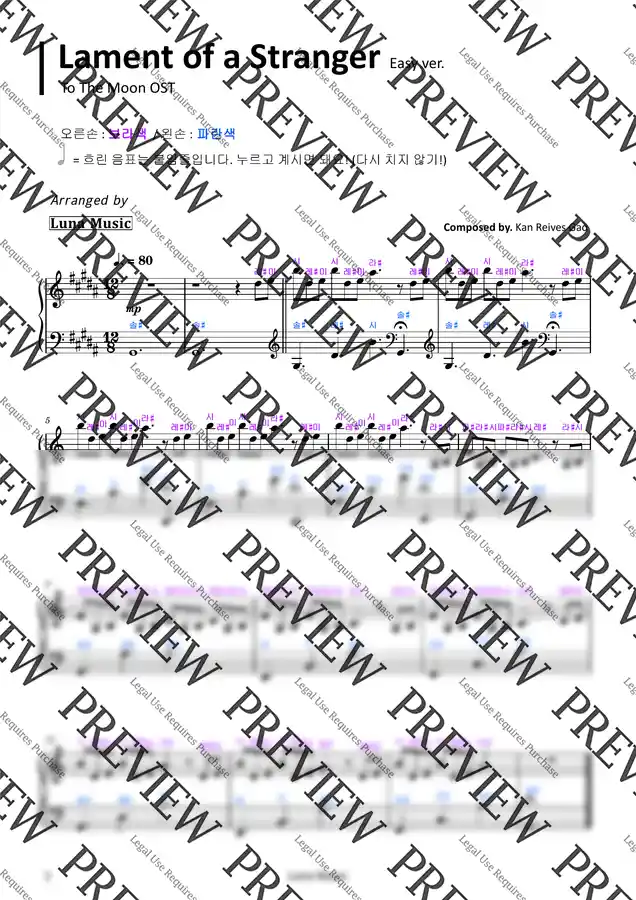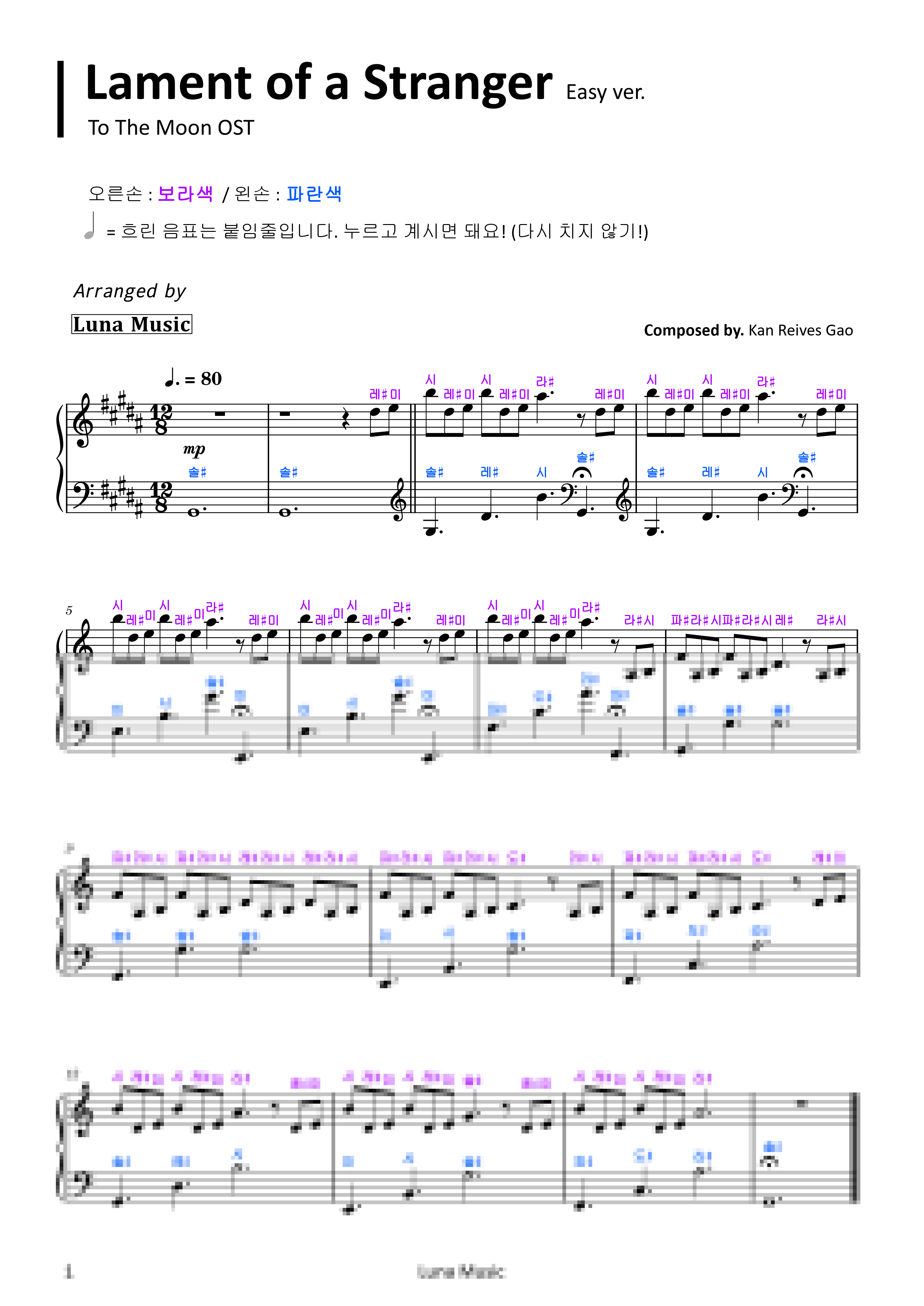 투더문 OST - Lament of a Stranger [쉬운 원곡악보] (계이름 악보) by 루나뮤직 Easy 1p 미리보기
