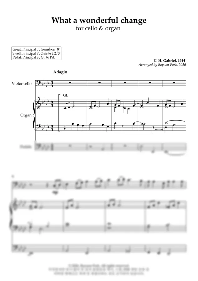 <주 예수 내 맘에 들어와>의 선율로 첼로와 오르간 듀오 앙상블 연주곡을 썼습니다. 두 악기의 볼륨을 감안하셔서 오르간 레지스트레이션을 만드시면 됩니다. 좋은 시간 되세요~