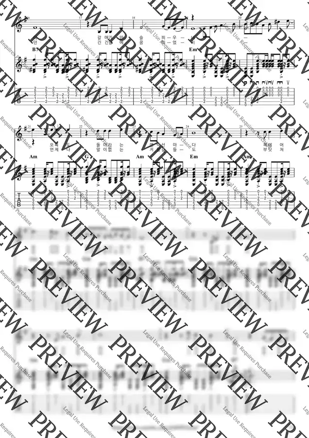(+) 악보는 오선, 타브, 운지, 코드 다이어그램 등 모든 기보를 다 표현하도록 업데이트 된 연습용 원본(Master) 악보와, 페이지 넘김을 최소화 한 제본용(Performance) 악보까지 두 개의 악보를 모두 제공해 드립니다. 원본 악보로 연습한 후 제본용 악보를 악보집에 담아 편리하게 연주하실 수 있습니다. (2페이지 이내면 원본, 제본 악보 동일할 수 있음)