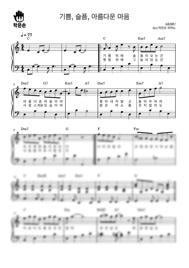 오늘은 AKMU의 '기쁨, 슬픔, 아름다운 마음'을 피아노를 막 시작하신 분들도 즐겁게 연주하실 수 있도록 바이엘 난이도로 편곡했습니다. 🧸