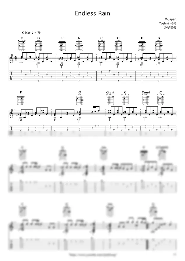 |우클통|의 악보는 오선+타브+가사+운지+코드 등을 잘 기록하고 있습니다.