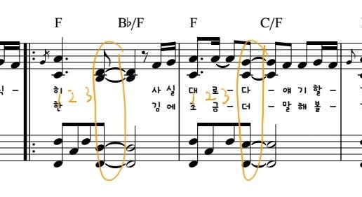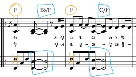 위에 주황색표시로된 코드를 보면 코드가 하나적혀있죠. 그렇다면 과감히 옥타브 음들을 버려도 됩니다. 하지만 파란색표시의 코드는 슬레쉬라고 해서 코드가 두개적혀있습니다. 이런화음은 지켜서 연주를 해주셔야 소리가 부족하게 들리지 않습니다~