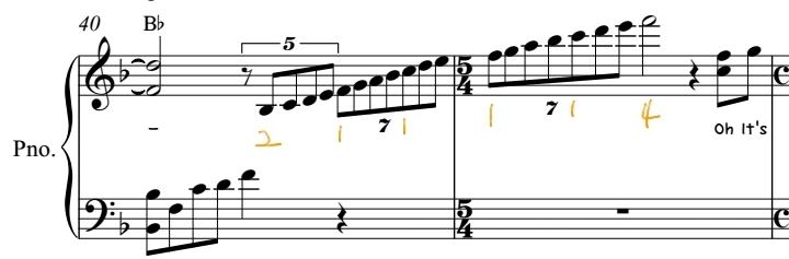 고조되는 느낌을 주기위한 스케일 사용입니다. 스케일을 연주하실때 보통은 1번손가락부터 사용하지만, 검은 건반을 눌러야 할때는 1번손가락이 아닌 2번손가락을 사용합니다. 위의 숫자는 스케일 연주하시기 편한 손가락번호(제가 연주할때 사용한 번호)입니다. 스케일을 연주하기 앞서 주의할 점은 고른소리내기인데요. 보통 엄지손가락은 안으로 넣어서 점점올라갈때 고르지 못한 소리가 날수 있습니다. 그이유는 손가락의 균형때문인데요. 손가락 5개가 다 길이가 다르기때문에 밸런스를 잘 맟춰줘야 되는 부분인데 더군다나 엄지는 제일 짧고 뭉툭해서 힘도 많이 들어갑니다. 그래서 이러한 스케일을 연주하실때 엄지의 힘을 풀고, 엄지손가락을 세워서 고른소리를 낼 수 있도록 해주셔야 됩니다^^