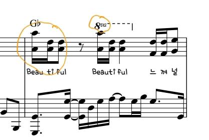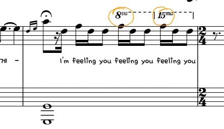 옥타브 8va와 15ma 사용으로 메아리처럼 울리는 효과를 주고 싶어서 사용해봤습니다. 8va는 8도 위에서 연주하라는 표시이고, 15ma는 15도 위에서 연주하라는 뜻입니다. 즉, 같은음을 한옥타브 위로 점점올라가면서 두번연주하시면됩니다. 보통 가요를 연주하실때 노래부르는 음역대에서만 많이들 연주하시는데요. 위치마다의 매력적인 음색들이 있습니다. 다양한 곳에서 사용해 보시면 좀더 풍성한 소리를 내실 수 있습니다^^