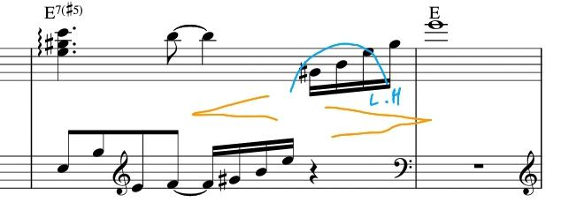 잔잔한 분위기 연출로 아르페지오 애드립이 사용되었습니다. 저는 이렇게 나눠서 양손을 사용했습니다. 정답은 없기때문에 편한손에 맞게 나누어 연주하시면 됩니다. 이때 크레셴도와 데크레셴도까지 함께 넣어 연주하면 더 멋진 연주가 됩니다