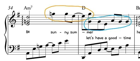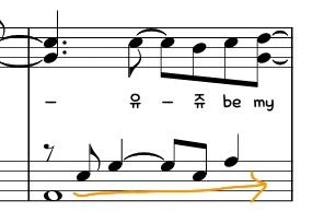 옥타브 솔을 기준으로 가사가 두줄로 나눠졌있는 부분을 볼 수 있습니다. 옥타브간격으로 올라가고 내려가기때문에 주고 받는 느낌으로 연주해주세요~ 빠르게 이동해야되기 떄문에 미스터치를 주의해 주세요~