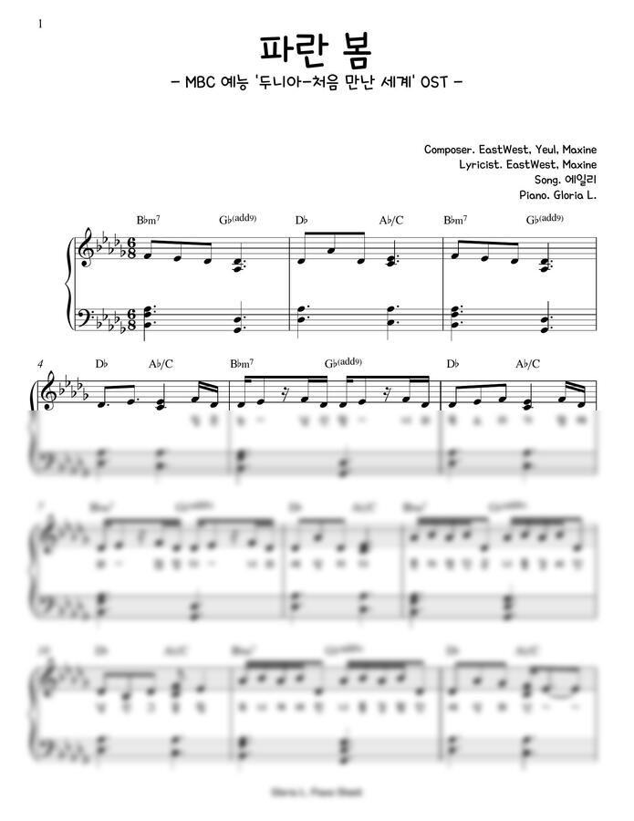 이번악보는 예능프로 '두니아~처음 만난 세계'OST 인 에일리가 부른 파란봄입니다.