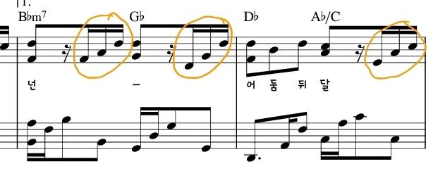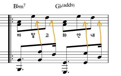 후렴구에서 오른손에 애드립이 자주 등장합니다. 애드립 부분은 멜로디 보다 튀지 않게 연주해 주세요~