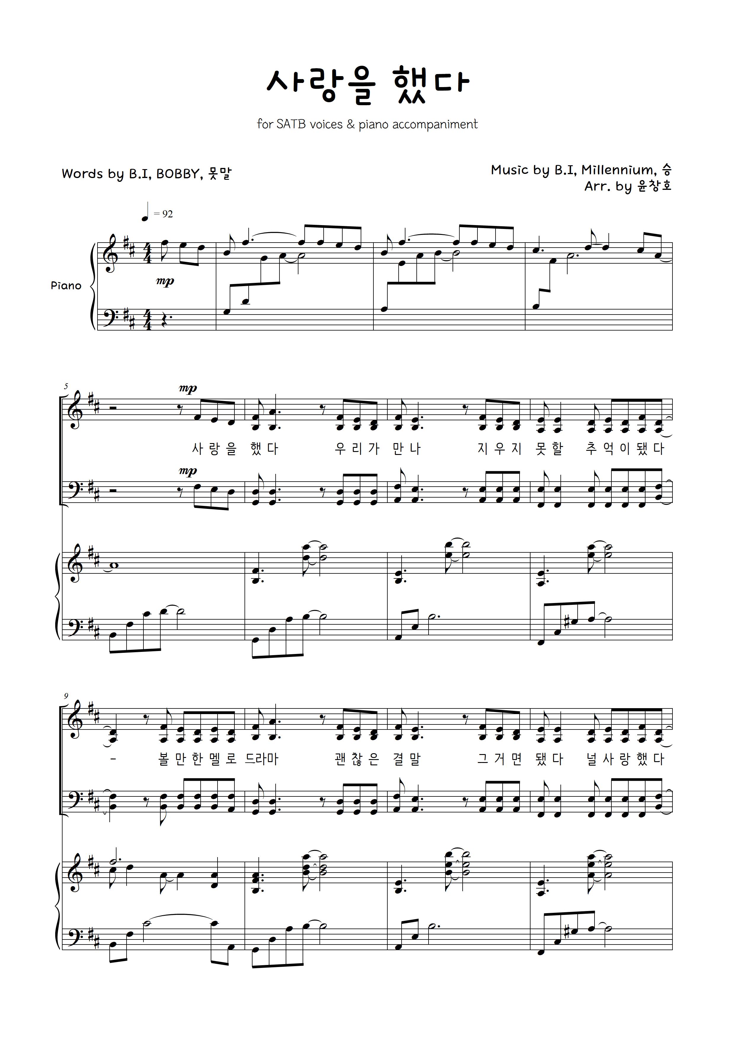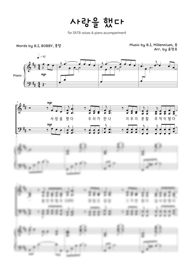 iKON (아이콘) - 사랑을 했다 (LOVE SCENARIO) (4부 합창 악보) by 윤창호