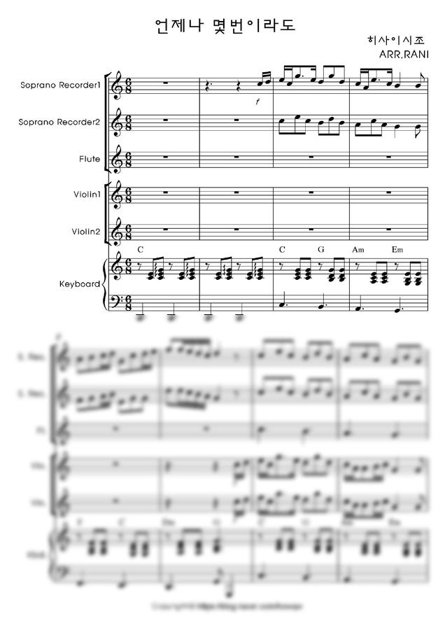 편곡한 악기는 리코더 (1,2), 바이올린 (1,2), 피아노, 플릇, 기타 입니다-