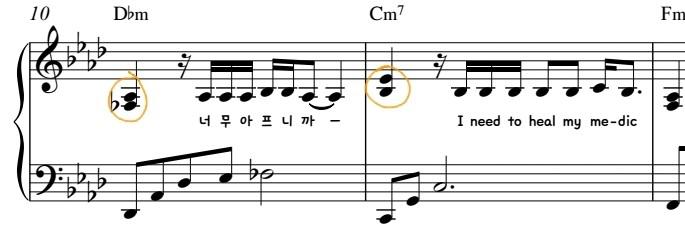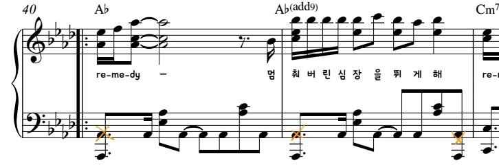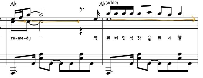 이번곡은 이렇게 후렴구 부분에서 지속음이 사용되었습니다. 오른손의 지속음을 잘 눌러서 곡의 분위기를 더 풍성하게 연주해주세요^^