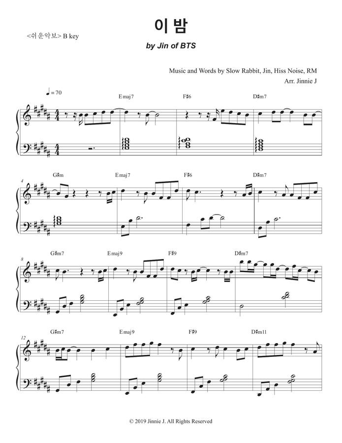 방탄소년단 진의 자작곡 "이 밤" 편곡 악보입니다