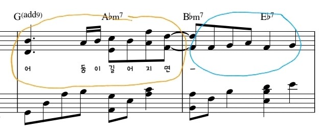 이번곡은 중간중간 오른손에 멜로디와 애드립 라인이 주고 받는느낌으로연주가 됩니다. 애드립라인은 멜로디가 아니기때문에 멜로디 느낌이 나지않게 조금 작게 연주해주셔야 멜로디라인을 잘 살리실 수 있습니다^^