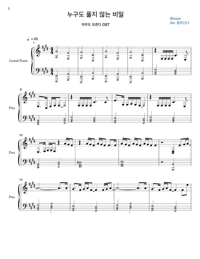 아무도 모른다 OST 리차드파커스의 누구도 풀지 않는 비밀 피아노 2단 악보입니다~