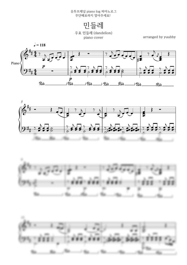 "민들레"는 3년 전인 2017년 5월 30일에 발매된 노래예요. 현악악단(String Ensemble)이 경쾌한 스타카토의 동음반복과 함께 음악이 시작되고, 우효 특유의 편안한 목소리가 '조건과 이유를 따지지 않는 진실된 사랑'에 대한 노래로 얹어져요. 신디팝의 요소들이 차례로 쌓이며 후렴이 되어 본격적인 드럼과 기타가 가세하며 함께 어울리는데, 그런 와중에도 곡 전체의 후경을 현악악단의 아주 풍부하고 낭만적으로 연주되는 것이 큰 특징인 것 같아요. 이런 여러 요소를 피아노 한대로 표현하기 위해서 가장 중요하고 특징적인 소리들을 위주로 과감히 편곡했고, 성부를 나눠서 각 악기의 구성음들을 두 손의 피아노로 효과적으로 연주할 수 있도록 만들었어요.