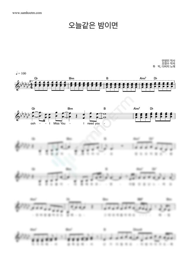 투빅 - 오늘같은 밤이면 (With 다비치) by 악보마트