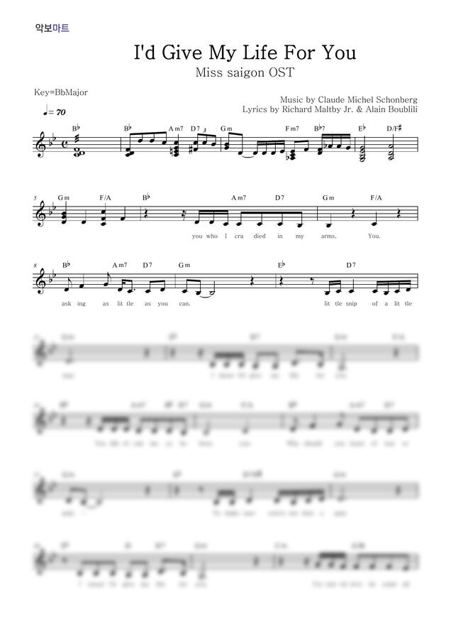 미스 사이공 OST - I'd Give My Life For You by 악보마트 1p 미리보기