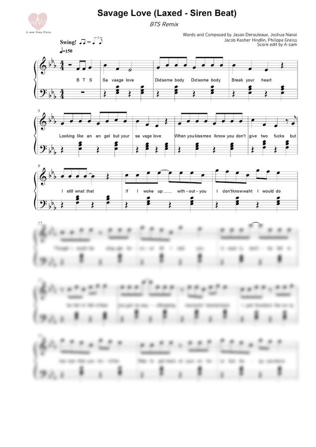 BTS가 리믹스한 'Savage Love' 를 연주하기 쉽게 악보로 만들었습니다.