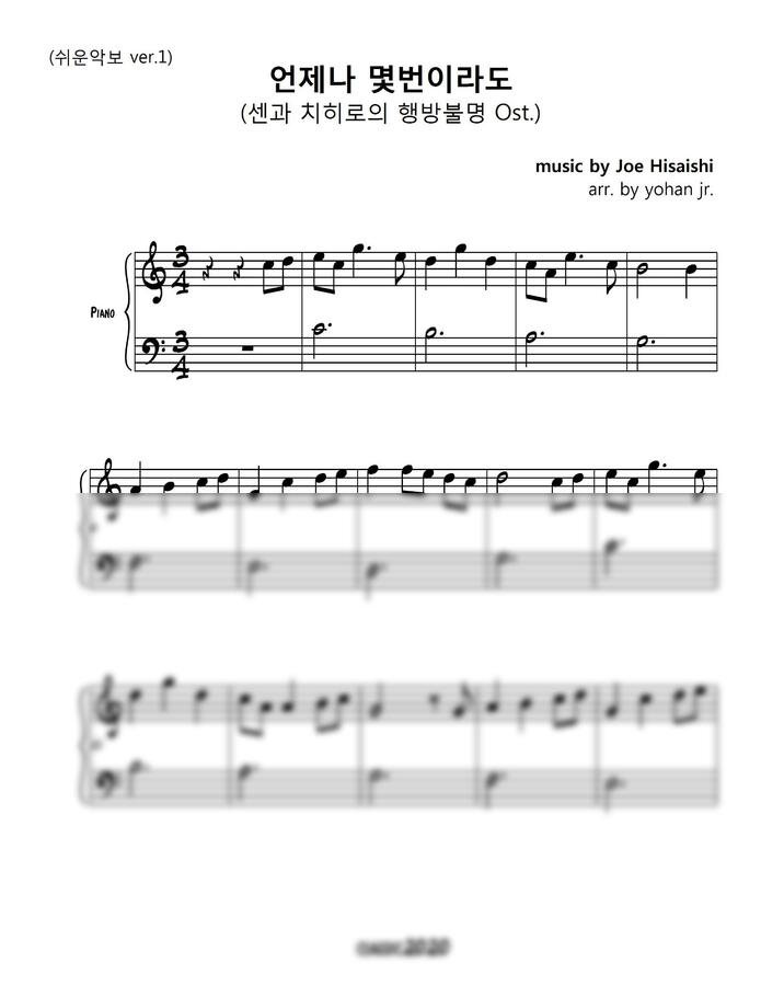 센과 치히로의 행방불명 OST - いつも何度でも (언제나 몇번이라도) (쉬운 악보) by classic2020 1p 미리보기