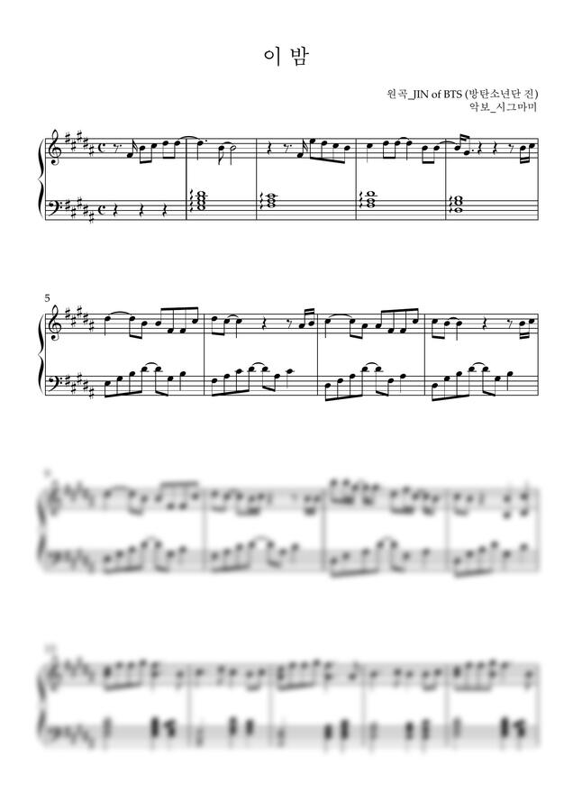 방탄소년단의 멤버 진의 '이 밤' 피아노 커버 악보입니다.