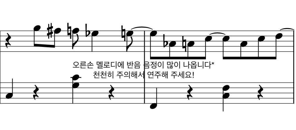 오른손 멜로디에 반음 음정으로 도약하는 부분이 많이 나옵니다!
