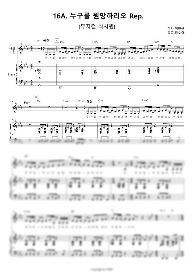 뮤지컬 <최치원> 의 공연용 피아노 리덕션 악보입니다.