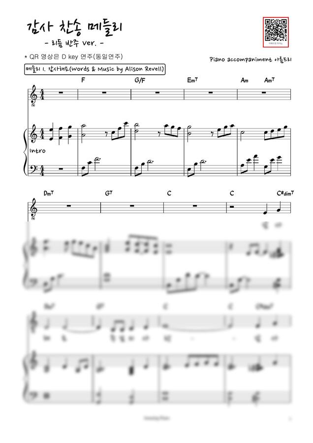 본 악보는 감사해요, 감사(손경민), 또 하나의 열매를 바라시며 총 3곡의 찬양곡을 D key로 연결해서 1곡처럼 만든 감사 찬양 메들리 입니다. 3개의 악보를 연결하셔야 영상 연주처럼 메들리 연주가 완성이 되며, 첨부 파일로 3개의 악보를 확인하실 수 있습니다.