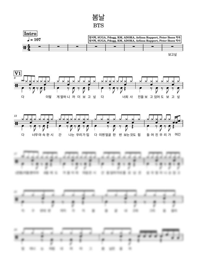 BTS(방탄소년단) - 봄날 드럼악보입니다!