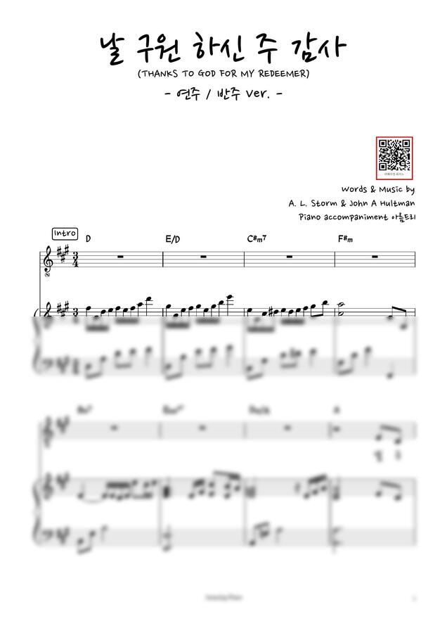 날 구원하신 주 감사 피아노 악보(Thanks to god for my redeemer)