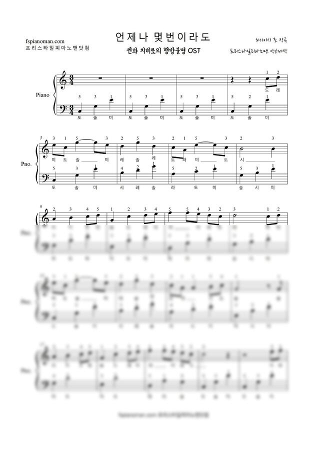 센과 치히로의 행방불명 OST - いつも何度でも (언제나 몇 번이라도) (손가락번호,다장조,계이름악보) 입니다