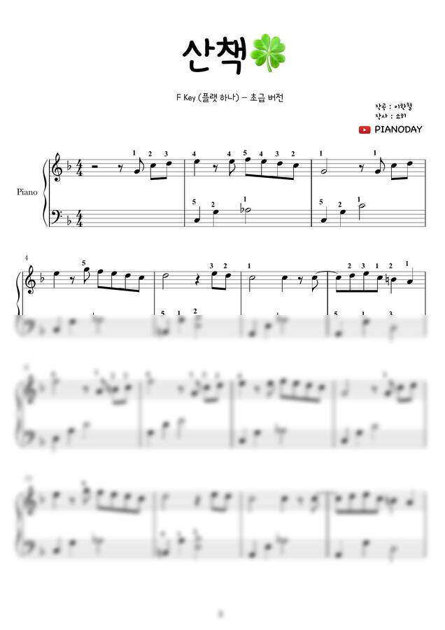 백예린 산책 피아노 악보(F Major, 플랫 하나), 초급 버전입니다. 체르니 100 이상은 되어야 수월하게 치실 수 있을만한 난이도입니다. 곡 처음부터 끝까지의 분량이며 전주와 간주는 생략했습니다. 그리고 초보자분들을 위한 도움이 될만한 손가락번호를 써놨습니다^^