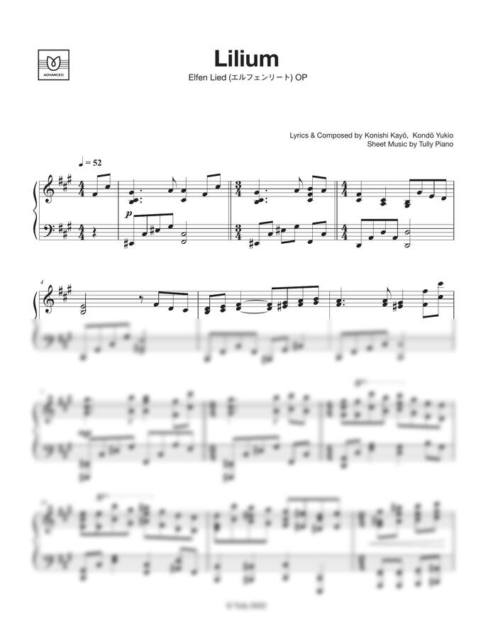 일본 애니메이션 Elfen Lied (エルフェンリート) OST 중 오프닝 곡인 Lilium 피아노 악보입니다.