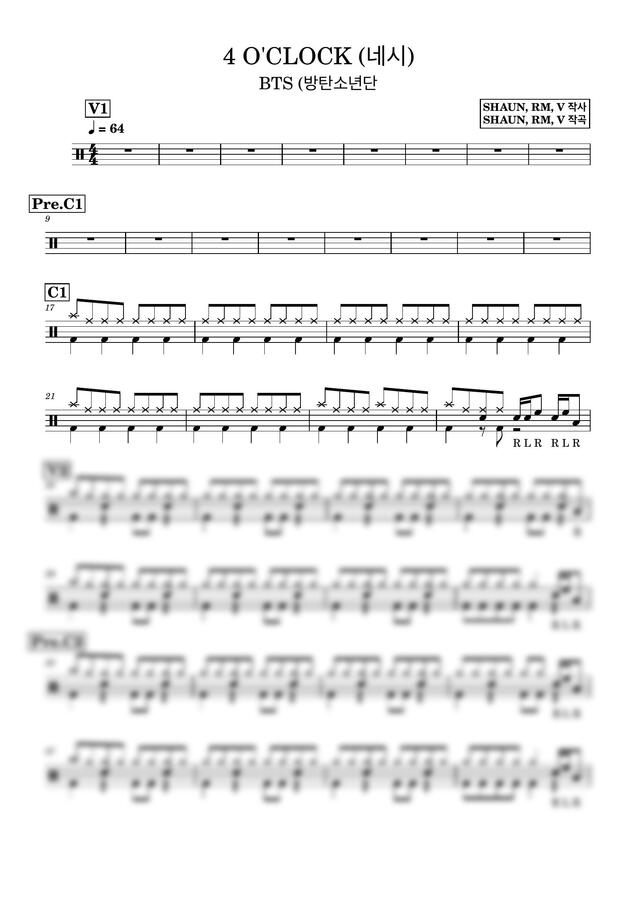 BTS R&V(방탄소년단) - 4 O' Clock (네시) 드럼악보입니다!